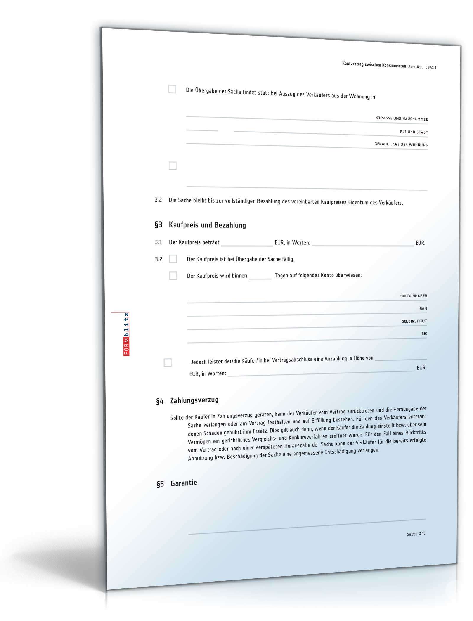 Nutzen Sie dieses Muster für einen Kaufvertrag, wenn Sie als Konsument einem anderen Konsumenten eine Sache verkaufen möchten. Es ist immer anzuraten dies schriftlich zu tun. So weiß jede Partei über die zugrundegelegten Bedingungen bescheid. Unser Vertrag enthält einen Gewährleitungsausschluss und regelt alle weiteren relevanten Punkte umfassend und rechtssicher. Einfach downloaden und ausfüllen.